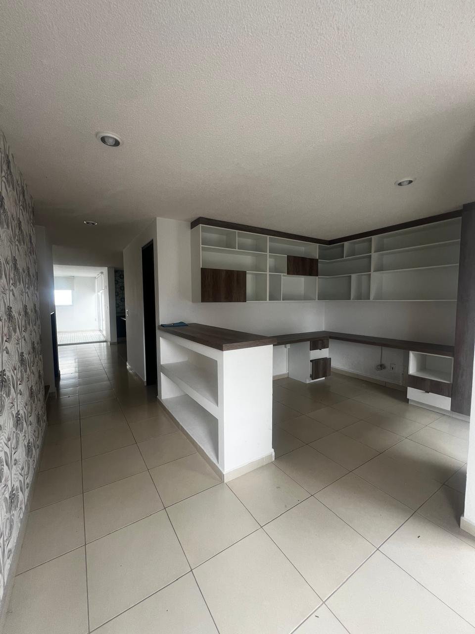 Cocina abierta con isla y amplia alacena.